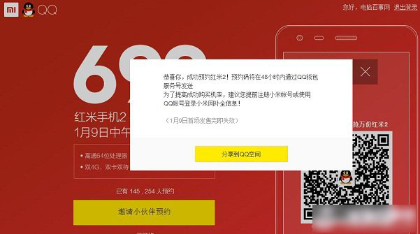 2、之后就可以看到:恭喜你,成功预约红米2!预约码将在48小时内通过QQ钱包服务号发送,如下图所示。