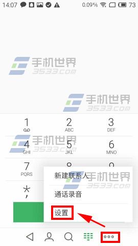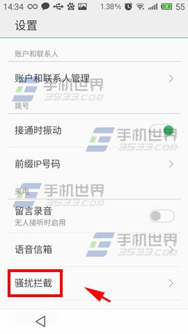 1)打开魅蓝note的拨号界面,点击【三点】进入【设置】,点击【骚扰拦截】。(如下图)