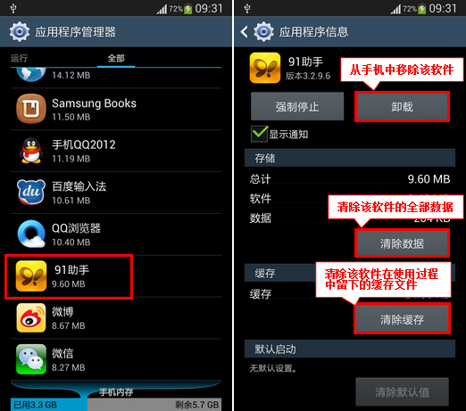 5.选中您想要优化的应用程序(这里以“91助手”为例)。进入后,您可以直接选择“卸载”、“清除数据”、或“清除缓存”,来进行优化,从而来释放您的机身内存(部分应用不可删除)。