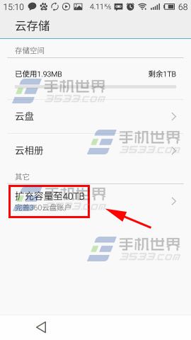 打开魅蓝note手机【设置】点击【帐户】选择【云存储】,在云存储中找到并点击【扩充容量至40TB】,按要求完善帐号即可。(如下图)