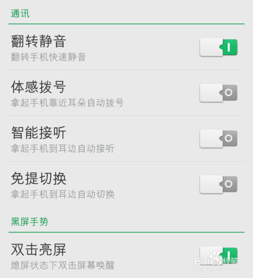 6、另外,我们为了更加方便的使用手机,可以设置一些其他的便捷功能,比如我们可以在页面上,打开 翻转静音、智能接听、双击亮屏等功能。