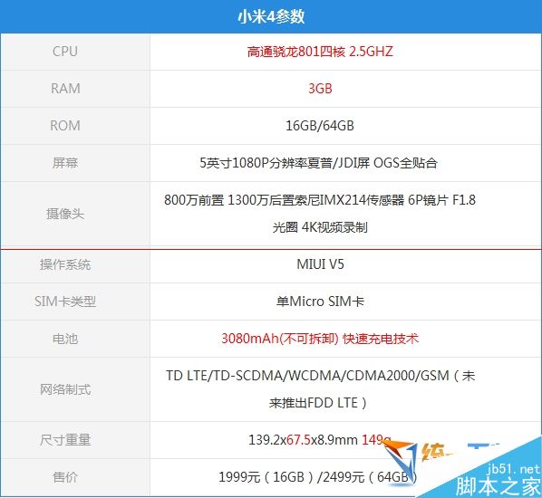 小米4采用顶级的配置。搭载高通骁龙801四核处理器,主频2.5GHz。3GB RAM运行内存,16/64GB存储空间。配备5英寸1080P分辨率夏普和JDI屏幕,采用OGS全贴合工艺。800万前置+1300万后置索尼堆栈式摄像头。小米特意提到其3080mAh高容量电池,并采用2种快速充电标准,最快可2.5小时内充满。小米4将于7月推出联通版、8月推电信版、9月推移动4G版,并保证两月内供货100万台。16GB售价依然是1999元,64B售价2499元。