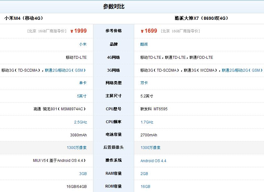 小米4和酷派大神X7参数对比图
