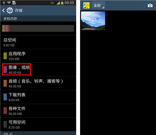4.单击每个项目后可以查看占用内存程序详情,这里“图像,视频”为例。(手机可用空间的大小,会随着您的使用情况而变化)