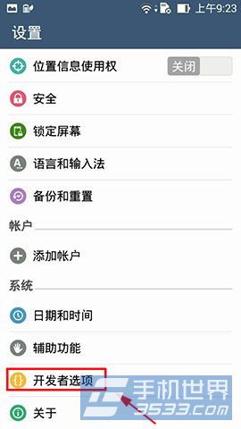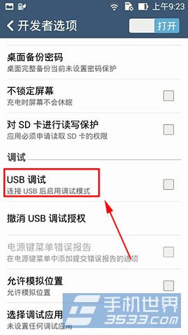 3)返回华硕飞马手机设置点击【开发者选项】,将该功能打开后勾选【USB调试】即可。(如下图)