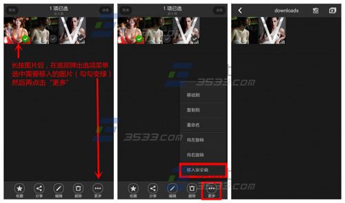 1)打开大神f2【相册】长按图片后勾选要移入的图片,点击【更多】选择【移入安全箱】。(如下图)