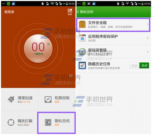 2)打开安全箱方法一:打开【酷管家】点击【隐私空间】选择【文件安全箱】输入密码即可查看。(如下图)