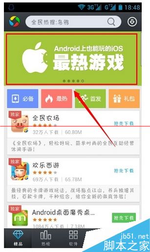 1.首先需要打开手机中的应用宝,通过翻转找到上方公告栏里的’Android也能玩IOS游戏“的公告,打开它进入到合集界面。
