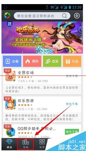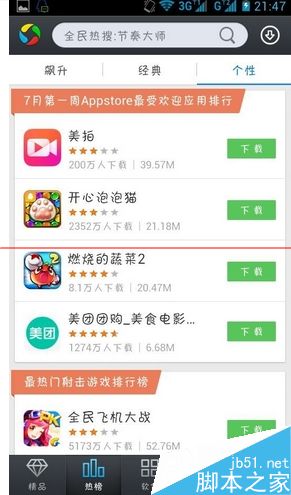 1.进入到手机应用宝之后,可以看到最下方有精品、热榜、软件、游戏和管理五大界面,这次我们进入到热榜界面。