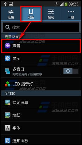 1)打开三星note3手机【设定】,点击【设备】选择【声音】。(如下图)