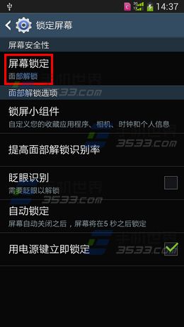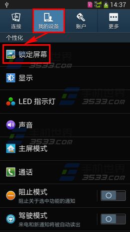 1)打开三星S4手机【设定】点击【我的设备】选择【锁定屏幕】,点击【屏幕锁定】。(如下图)