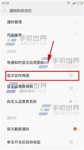 打开小米Note手机【设置】点击【通知和状态栏】,进入该功能后将【显示实时网速】开启即可。(如下图)