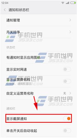 打开小米Note手机【设置】点击【通知和状态栏】,关闭【显示截屏通知】即可。(如下图)