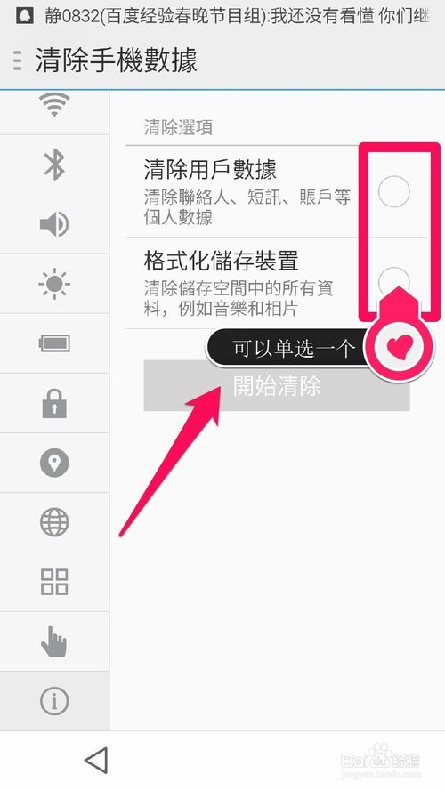 6,进入储存空间,点 清除手机数据,选择你清除的选项(可单选)清除联络人,短讯,帐户等个人数据,如图
