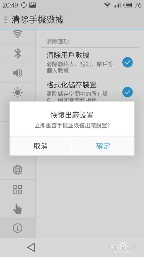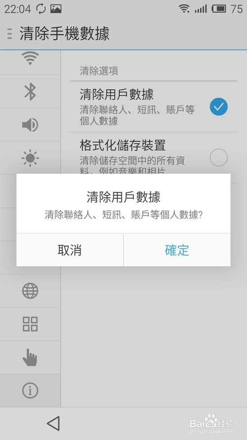 7、进入储存空间,点清除手机数据,两项都选中这个就是恢复出厂设置,点确定,就恢复出厂设置了,恢复出厂设置时请备份好自已有用的联络人,短讯,帐户,图片等个人数据资料,如图