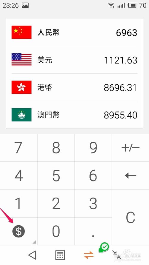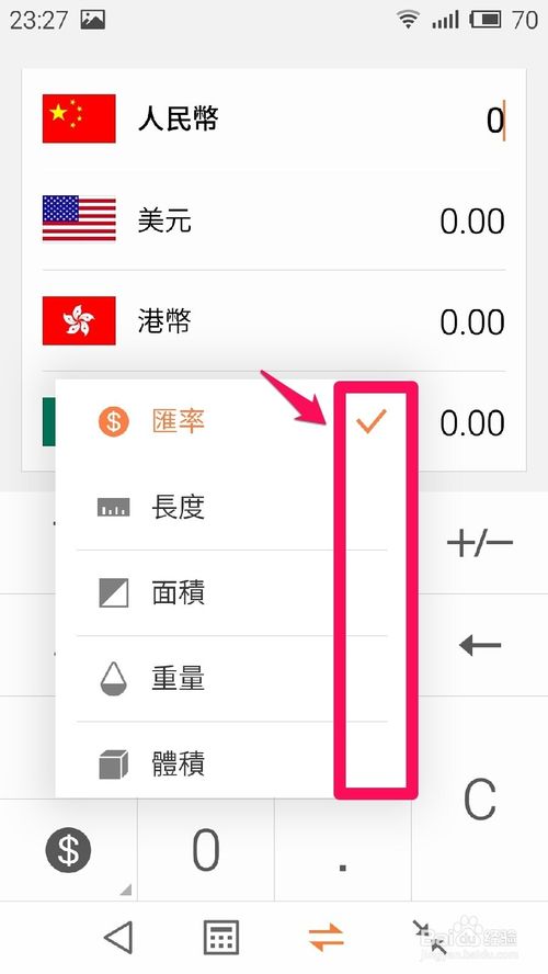 3、点单位换算(支持一些常规的单位换算),(1.汇率(货币换算),可以在随便选一个货币种类后面输入数值进行换算),还可选择