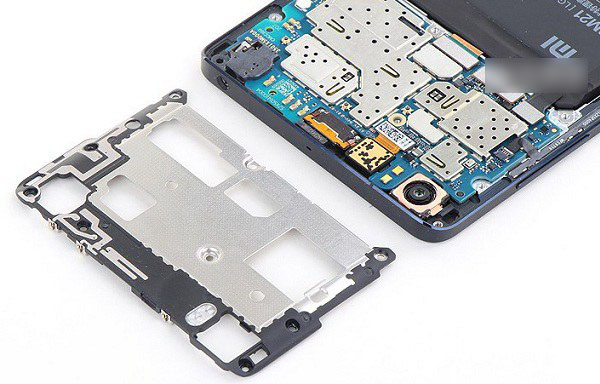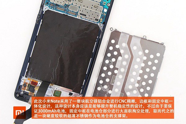 小米Note采用了一整块航空铝镁合金进行CNC精雕,边框和固定中框一体化设计,这种设计本身应该是能够提升整机稳定的。不过由于要保证3000mAh电池,固定中框在电池仓部分进行大面积掏空处理,取而代之的是一块硬度较软的超薄不锈钢作为电池仓的支撑架,如下图所示。