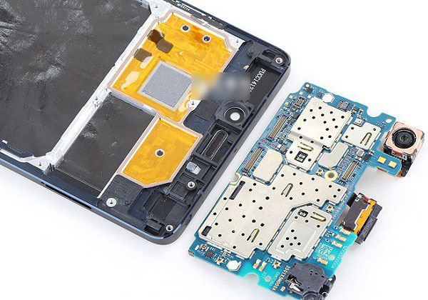 小米Note核心硬件都位于机身顶部的这块PCB主板上。并且顶部固定中框也根据主板芯片位置不同,精雕出不同的区域,能够起到屏蔽芯片信号之间的干扰作用。