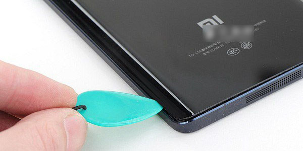 小米Note正面采用2.5D弧形玻璃屏幕设计,背面则采用弧度更大的3D弧形玻璃设计,拆机时从背面开始的。小米Note后盖采用了卡扣式固定,拆机前需要借助薄片从细节的划痕处开始找到缺口,如下图所示。