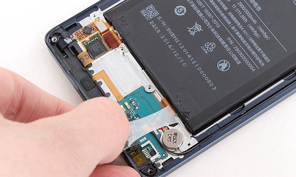 拆机后,我们会发现小米Note电池也比较容易拆解,这意味着如果小米Note电池损坏,如果可以买到电池的话,也可以自行更换。小米Note电池采用类似于3M魔术胶的可抽拉双面胶,拆解过程中只需要将固定胶从电池底部抽出即可。可以不留痕迹、安全的将电池拆解下来,如下图所示。