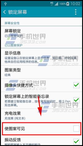2)打开三星note4手机【设定】点击【锁定屏幕】,取消【使图案可见】勾选即可。(如下图)