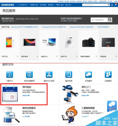 1、进入三星售后官网后,向下拉动滚动条,找到【预约到店】并点击进入