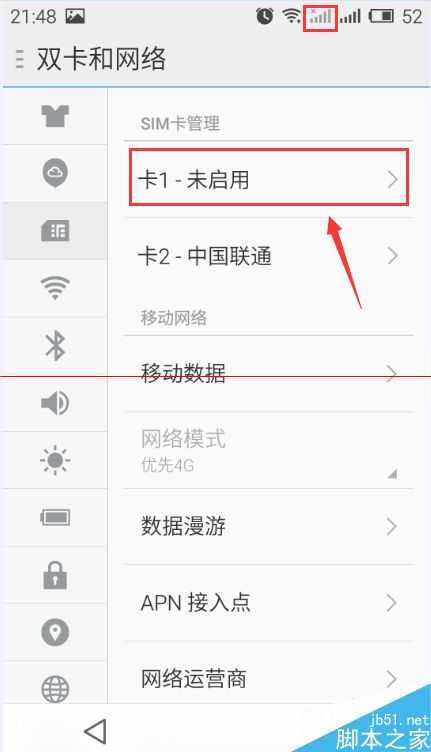 7、我们回到SIM卡管理,我们可以看到卡1未启用,然后我们可以看到上方的信号栏中,卡1是没有信号的。