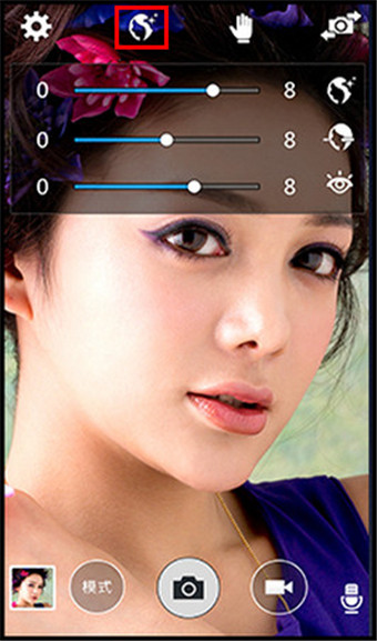 4.点击【美颜】图标,通过调节可修饰面部、瘦脸以及放大眼睛。