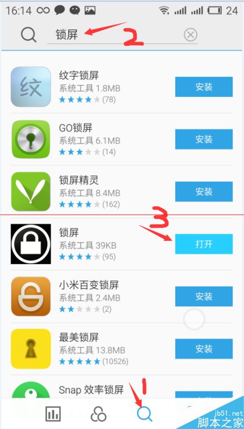 2、搜索“锁屏”,找到如图的锁屏工具(大小才39KB,不建议挑选其他工具),点击“安装”(图中因手机已安装过,所以是“打开”按钮),