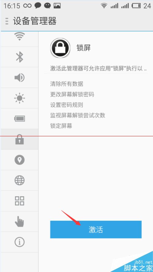 3、首次安装后打开,会跳转到“设置”中,要求激活,点击“激活”后锁屏工具就生效啦