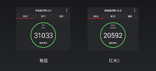 魅蓝采用联发科MT6732四核处理器,1GB RAM+8GB ROM,而红米2采用骁龙410四核处理器,也是1GB RAM+8GB ROM。从魅族发布会给出的安兔兔跑分对比来看,魅蓝分数达到31000分,而红米2只有20000分。当然跑分只是一个参考,实际性能有待观察。特别是魅族首次推出1GB RAM的千元机,能否足够使用有待观察。从近期玩过的几款1GB RAM新机来看,轻度使用几款常见软件还是没问题的,但如果启动大型游戏就有可能令部分后台软件被关闭。所以699的机子还是满足对手机要求不高的人群的,追求性能可以上魅蓝Note甚至1999元系列嘛。