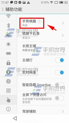 打开魅蓝手机【设置】点击【辅助功能】即手掌按钮。选择【手势唤醒】,将该功能开启后,我们可以根据所需设置画图形打开应用了。(如下图)