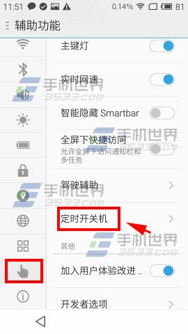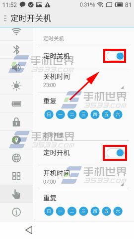 打开魅蓝手机【设置】,点击【定时开关机】,开启该功能后,设置好开机关机时间即可。(如下图)