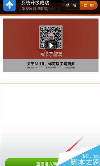 7、进度条走完,手机自动重装系统,升级完成出现的画面,直接点击《重启进入新系统》