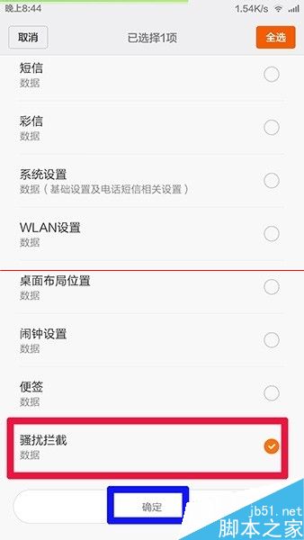 7、如下图,单击红框处 骚扰拦截,然后单击蓝框处 确定