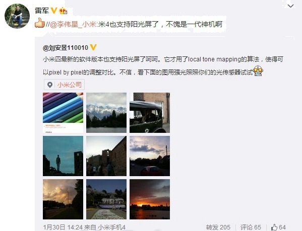 同时,雷军转发了这一微博表示“小米4也支持阳光屏了,不愧是一代神机啊”。因此很庆幸的告诉大家的是,看来小米4开始支持阳光屏了。不过和小米Note的阳光屏显示效果是否一样,有待后续实验。