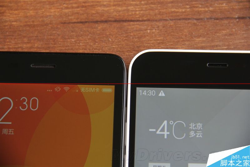 红米2的厚度为9.4mm 、魅蓝为8.9mm,加上魅蓝机身尺寸更大,视觉上魅蓝占有较大优势,整体握感上更显轻薄。