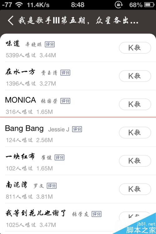 6、从明星演唱的歌曲中选择一首自己拿手的,点K歌开始录制,如果没有把握唱好整首,那就选择一个片段来演唱,如图所示。