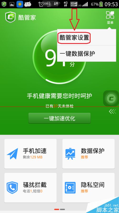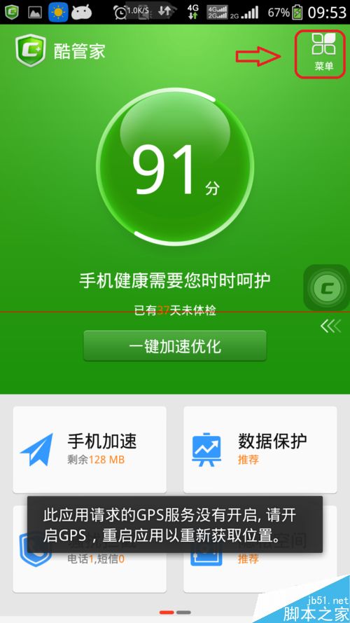 3、点击酷管家右上角的菜单按钮,如下图所示