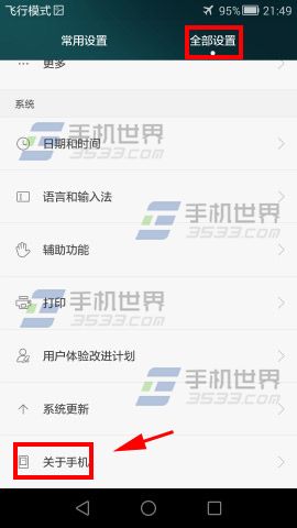 1)打开华为荣耀6plus【设置】选择【全部设置】点击【关于手机】,连续点击【版本号】。(如下图)