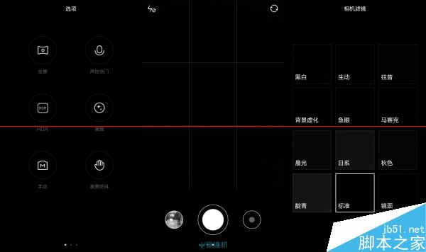 在红米2的取景框上左右滑动可以跳出滤镜和模式切换界面,不过相对于魅蓝爽快的滑动流畅度,红米2卡顿明显,UI就像看幻灯片一样不自然,不过红米2在选定对焦测光点之后可以很方便地调节曝光补偿,这点倒是魅蓝不具备的。