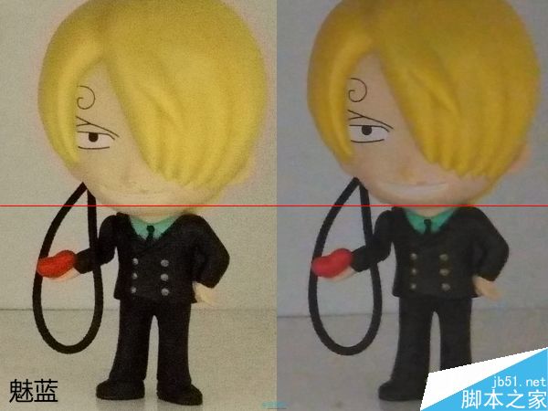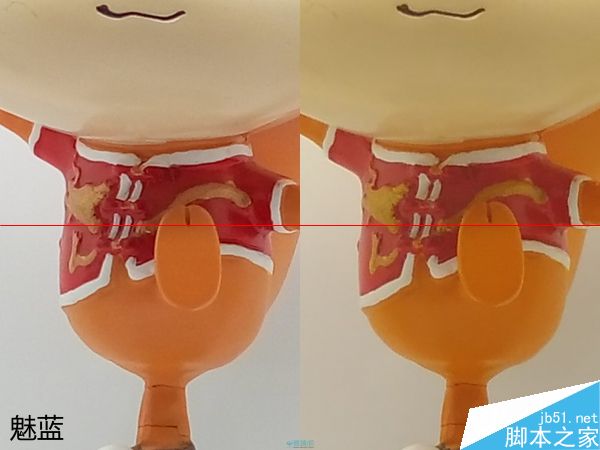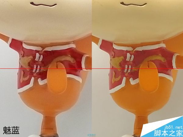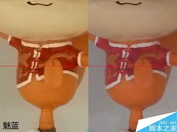 将样张中心放大,红米2的降噪涂抹就相当明显了,不过红米2的降噪涂抹手法并没有其他某些手机那样激进,整体画面依旧保留有还算OK的细节,也不会有明显的油画感,而魅蓝的画面中甚至出现了大量的串色噪点,比如玩偶红色衣服上本来是红色的部分都被渲染成了橙色,画面细节表现也不好,不过至少魅蓝的色彩饱和度和对比度还在。