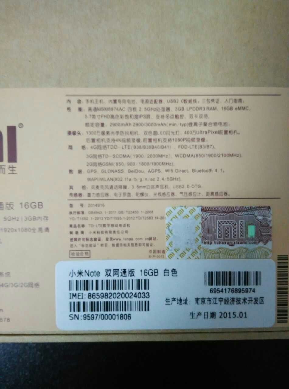 目前已经有多位网友反映买到了IMEI码为865982020024033的高仿小米Note,所以大家在通过第三方网店购买小米Note的时候,如果发现包装盒上的IMEI码为865982020024033,那么就可以肯定买到的是假冒的小米Note了。