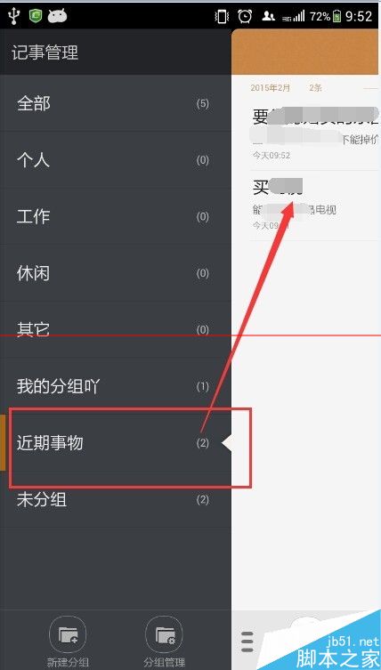 3、我们向左滑动屏幕,会有灰色“记事管理”出现。我们点击“记事管理”最下端的“新建分组”。