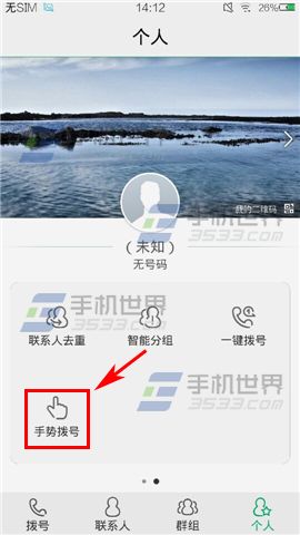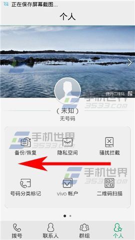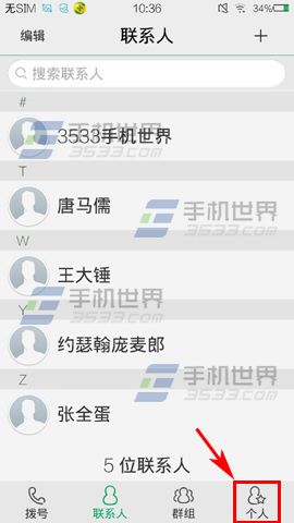 1)进入vivo X5Max【联系人】界面,然后点击【个人】,在菜单中用手指从右向左滑动。(如下图)