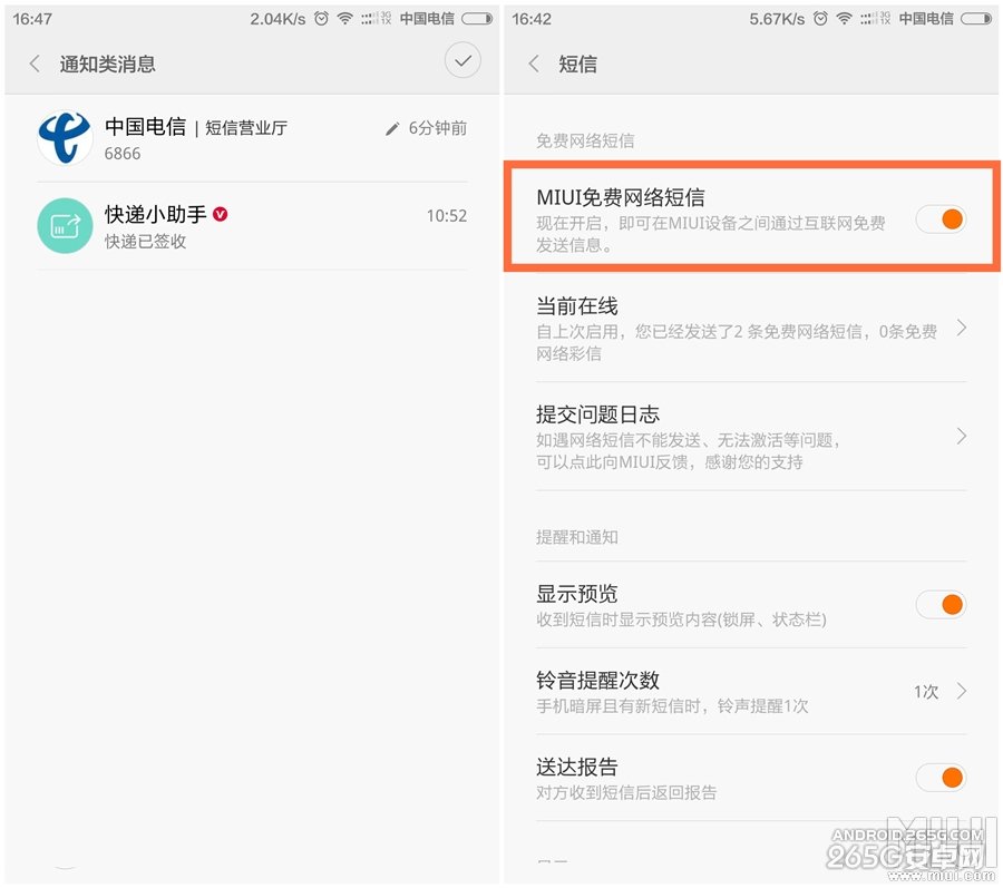 短信界面,长按左下任务键,打开MIUI免费网络短信。