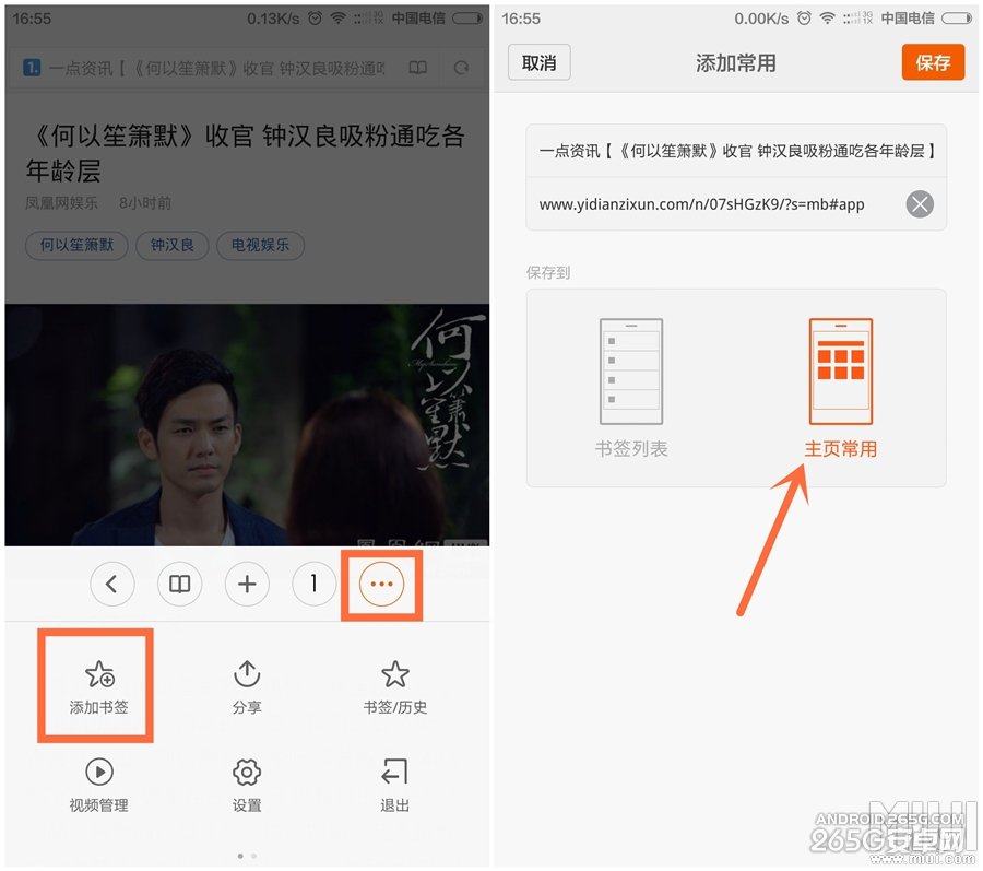 米粉朋友们会经常浏览某一网站,如果每次点开浏览器,再点击网址,会感觉很麻烦。MIUI浏览器可直接把常用网页发送到桌面,让你一键点击,方便快捷。方法:进入经常浏览的网页,点击更多(...)----添加书签----主页常用。