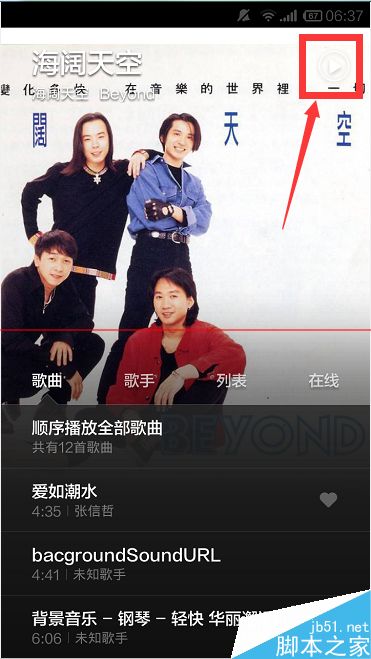 2、进入音乐的播放界面以后,小伙伴们可以在界面上看到之前最后播放过的那首歌曲,比如,现在小编的手机上显示的《海阔天空》的歌曲,我们直接点击右上角的那个白色三角形按钮即可播放了。