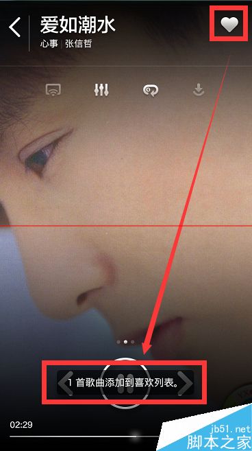 7、在播放的歌曲界面的右上角会出现一个很小的爱心按钮,如果小伙伴们用手指点击了那个爱心,那么就会把这首歌曲添加到我们喜欢的歌曲列表里面去了。