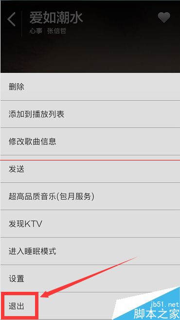 8、当我们听歌听了很久,不想再听了,想要退出那个音乐播放的手机界面,把音乐关掉,怎么办呢?很多小伙伴都不知道怎么关掉这个小米手机的音乐。其实,只要点击一下自己的手机上的那个三条横线的菜单键,手机界面上就会弹出来一个列表窗口,如图所示,我们在上面点击选择那个“退出”即可。